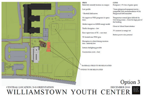 The new Youth Center will be built south of the school and be oriented in a north to south manner along the parking lot as depicted in the third of six options the architects submitted.
