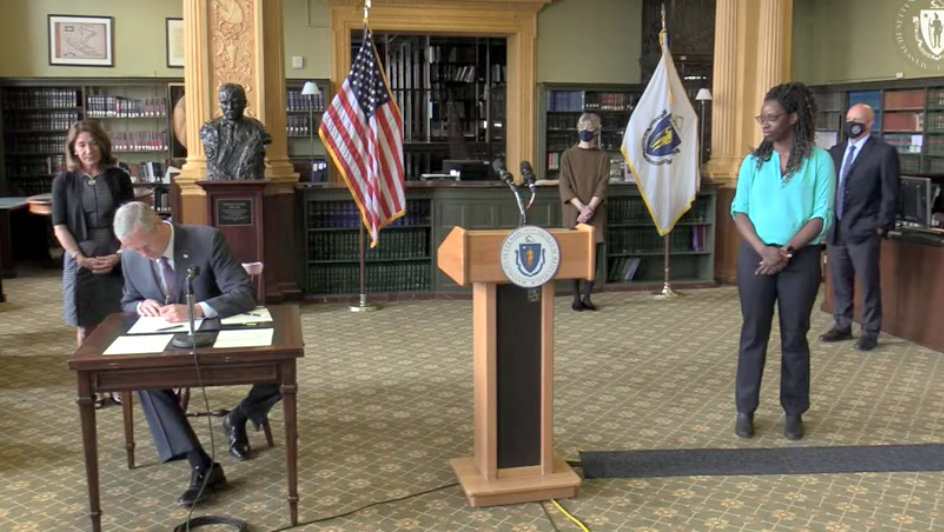 Gov. Charlie Baker signs an order on Friday rescinding the state of emergency declared in March 2020. |