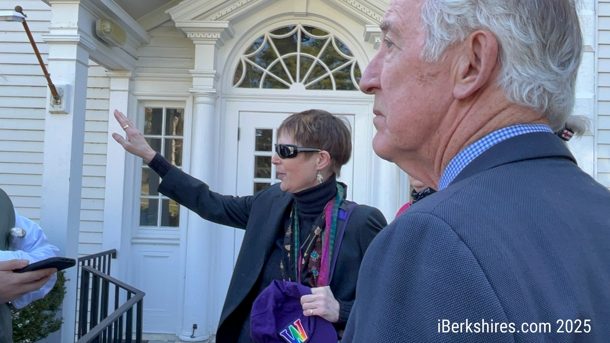 On Thursday, he was joined on the meetinghouse steps by state Rep. John Barrett III, D-North Adams, Sherwood Guernsey of the Berkshire Democratic Brigades and Carolyn Greene, president of the Williamstown Meetinghouse Preservation Fund.